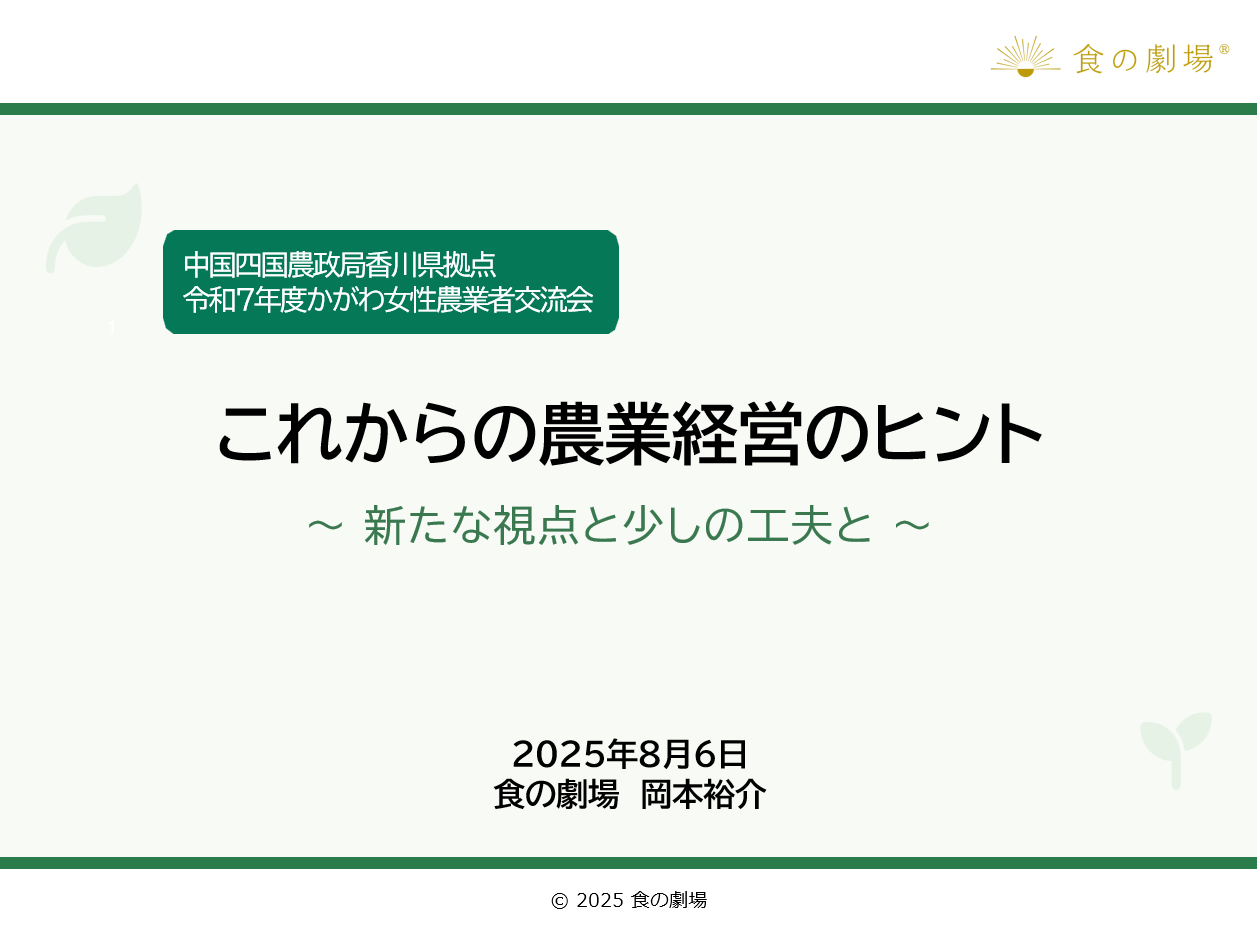 中国四国農政局 香川県拠点からご依頼をいただき、香川県内の女性農業経営者向けに「これからの農業経営のヒント」というテーマで講演させてもらいました。農業という仕事の基本的な立ち位置、日本の農業が抱える課題、女性ならではの視点を踏まえた農業経営の特長など、これからの農業経営を発展させるためのヒントになる話題をお伝えさせていただきました。これから女性が活躍できる環境や機会がどんどん増えて、女性経営者の事業がますます発展することをお祈りしています!!