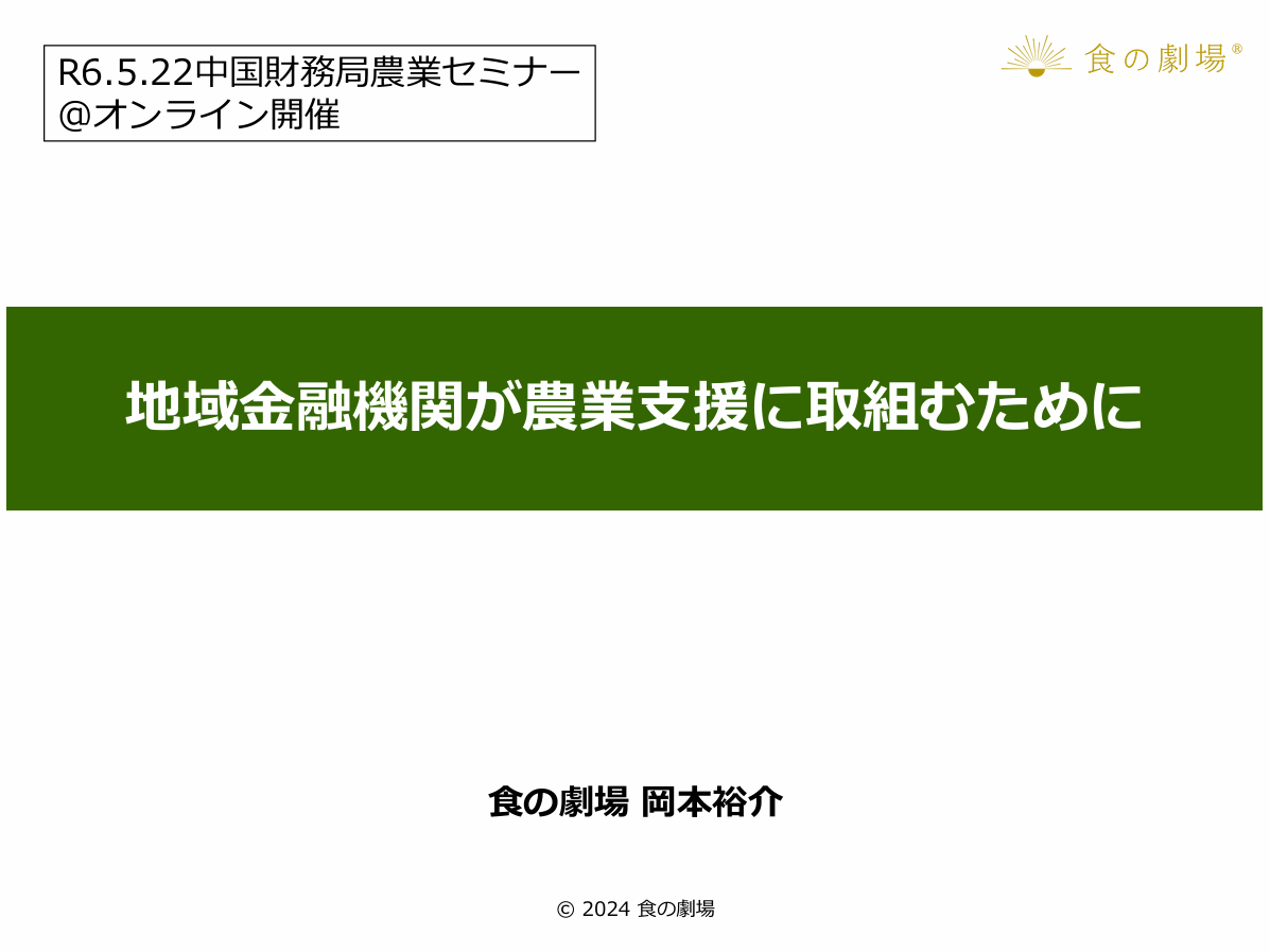 中国財務局ならびに日本政策金融公庫からご依頼をいただき、中国四国地域内の民間金融機関の農業担当者向けに「地域金融機関が農業融資に取り組むために」というテーマで講演させてもらいました。農業という仕事の基本的な立ち位置、日本の農業が抱える課題、最近の動向と今後の見通しなどマクロ、ミクロの両視点からみた農業についてお話させていただきました。農業経営に対する金融機関の理解が進み、農業者にとっても適切な資金調達ができる環境が増えることをお祈りしています!!