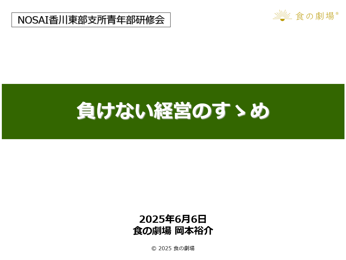 NOSAI香川東部支所青年部からご依頼をいただき、香川県東讃地域(さぬき市・東かがわ市)の農業経営者向けに「負けない経営のすゝめ」というテーマで講演させてもらいました。農業という仕事の基本的な立ち位置、日本の農業が抱える課題、勝つ経営と負けない経営の違い、経営を継続させるために必要な3つのポイントについてお話させていただきました。香川県東讃地域の農業振興と農業経営者の皆さまの今後ますますの発展をお祈りしています!!